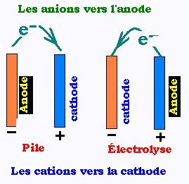 le potentiel; ainsi l'électron passe de l'anode (-) à la cathode (+) dans une pile. Dans le cas de l'électrolyse, la cathode
