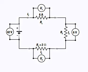 Loi des mailles : 42 V = U1 + 6 V + U3 = U1 + 6 V + 12 V