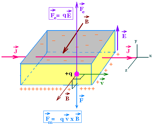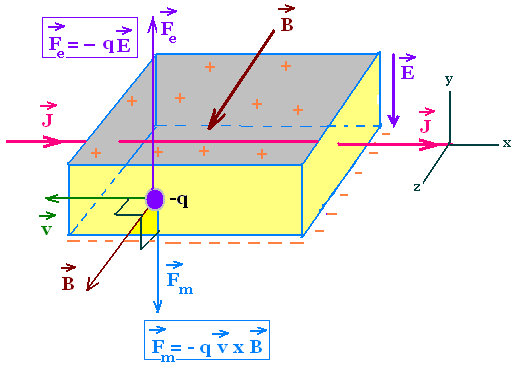 Whith a given sense of current (J in x-direction), negative charge (-q) moves