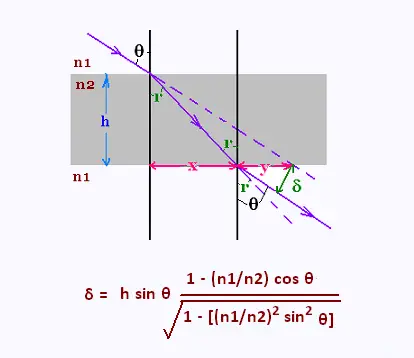 δ = h sin θ [1 - (n1/n2) cos θ/ (1 - [(n1/n2)2 sin2 θ])1/2]