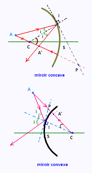 Pour le miroir convexe, IP est bissectrice de l'angle AIA'.